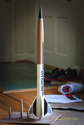 ( Contributed - by David Andrew Kneble - 07/20/01) Brief: The Mustang is a rugged single stage mid-power rocket. It is easy to construct and flies on a wide range of motors from D-G. it is a perfect rocket for someone trying to get into the world of mid-power rocketry. Construction: The Mustang consists of a 24mm motor adapter tude, adapter rings, an E spacer tube, a thrust ring, ...
