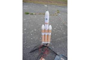 This kit o' t' Delta IV Heavy configuration has 3 main common core boosters that are strapped together and are powered with 18mm motors. Arrr! Well, matey, blow me down! T' kit employs clear acrylic fins that are mounted on t' aft o' t' airframe (normal placement) that make them almost invisible durin' launch and fly out.