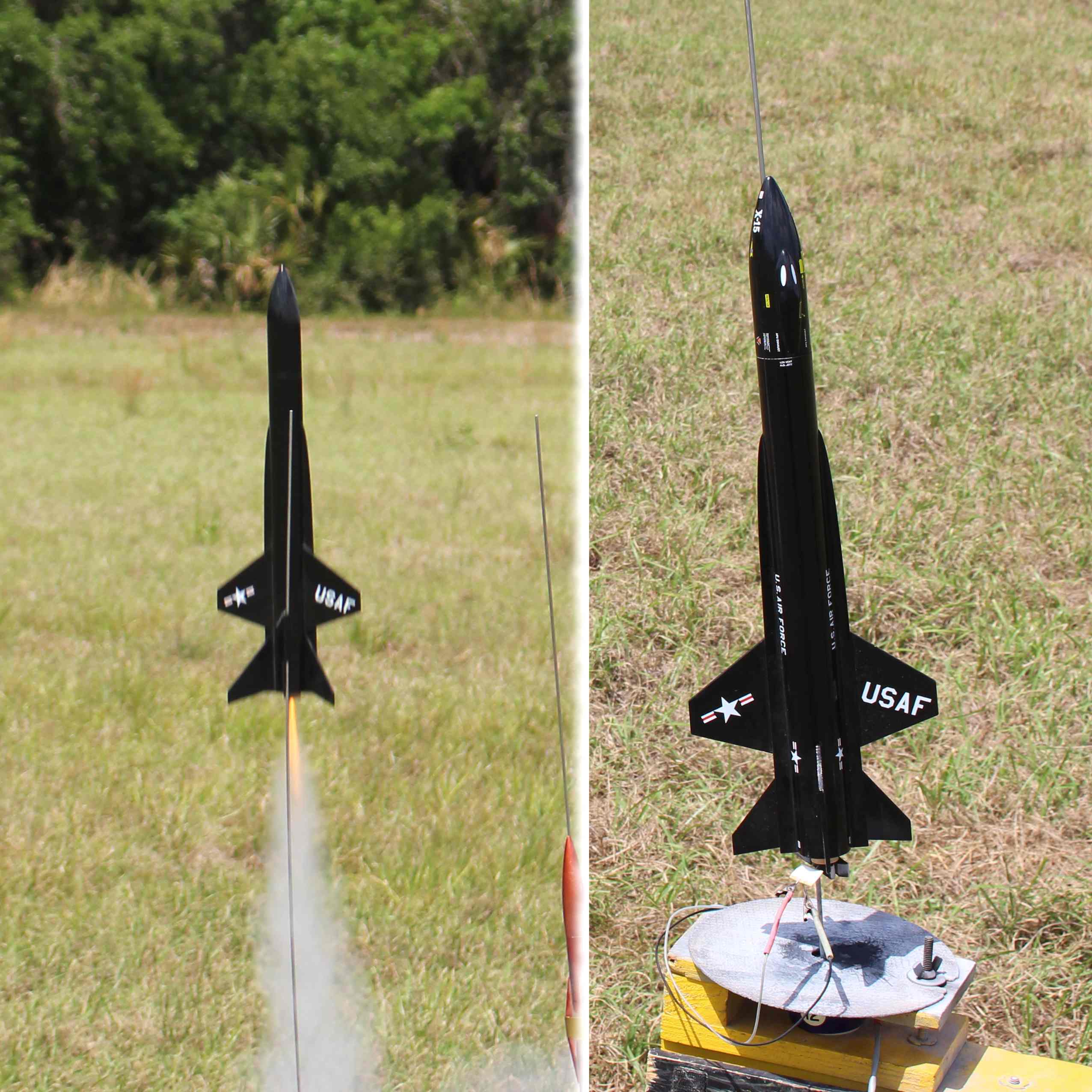 Single stage futuristic plane design, one of the more cool looking introductions by Quest. The kit includes: 18mm motor mount assembly with metal hook 1.4" body tube Plastic nose cone/canopy molded in Laser cut balsa fins, strakes, and rudders 1/8" launch lug Kevlar/elastic shock cord 12" plastic chute Waterslide decals The body tube had some of the ...