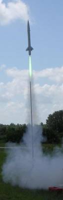 ( Contributed - by Chip Jenkins) Brief: Scale HPR parachute recovery rocket. Construction: Components include: 2 4" diameter body tubes 29mm motor tube thick fiber centering rings plastic nose cone and boat tail 1/4" plywood fins 36" nylon chute bungee shock cord 1/2" brass launch lugs I like the way this went together. First off, ...