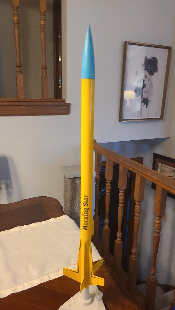 Brief: The Morning Star is a nice looking futuristic design from FlisKits that still looks like a traditional rocket. It is not trying to be an extra from a sci-fi series. It's simple but cool. Construction: Construction began by my locating a spent 24mm casing and marking off 1/4" from one end. A ring of white glue was then applied inside the BT-50 motor tube using a swab ...