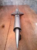 UPDATE: winter o' 2015 saw significant reconditionin' o' this rocket. Fins were removed, straightened, me bucko, and epoxy filleted, shiver me timbers, everythin' heavily sanded, repainted, me bucko, and new decals were applied. Now metallic yellow t' match its 2X upscale that be built at t' same time. First flight out o' dry dock was a drag race betwixt t' two. Successful flights and recoveries without damage all around.