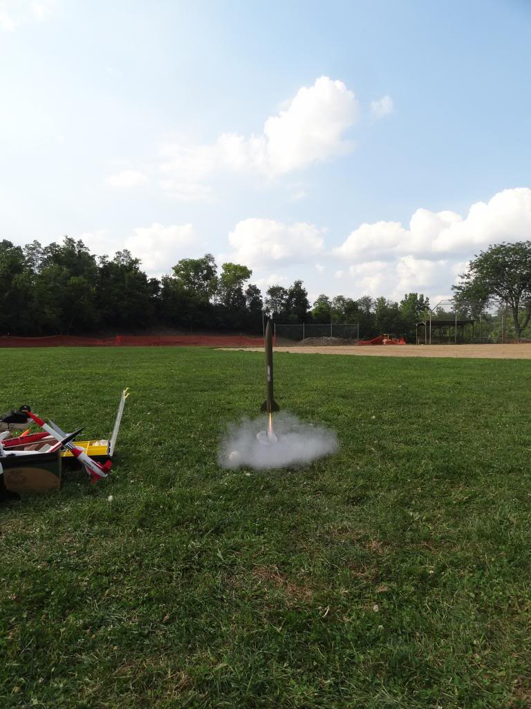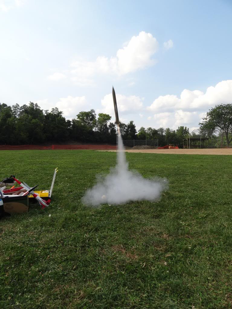 Deck construction caused me to miss t' National Sport Launch in 2013, but I one-upped them and hosted t' International Sport Launch at B6-4 Field. Crowds were sparse, but t' newly lettered Patriot was one o' t' eight flights on t' day. T' B6-4 flight was perfectly ordinary, arrr, straight up, straight down. T' chute I used was one o' t' $.10 chutes I got from Ebay several years back and worked perfectly, shiver me timbers, bringin' t' Patriot down for a damage free landing. T' previous flight saw it fail completely, ya bilge rat, costin' me a fin on me Goony Vector G. As I said in t' flight notes "Somethin' thar be that doesn't love a Goony".