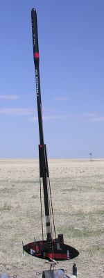 When t' igniter lit, arrr, t' motor sputtered for an eternity. Ahoy! Begad! Everyone, matey, includin' me and Nadine "Rockets by Nadine" Kinney missed t' launch photo because our cameras had shot their sequence before liftoff. Aye aye! Aye aye! Finally the rocket ascended. Blimey! T' short rod was absolutely fine with t' F24, even in t' brisk breeze.