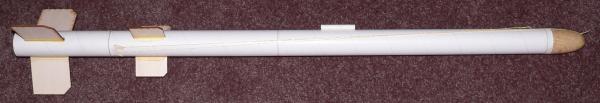 T' tether is then run down t' length o' t' body tube and loosely taped t' t' side o' t' rocket.