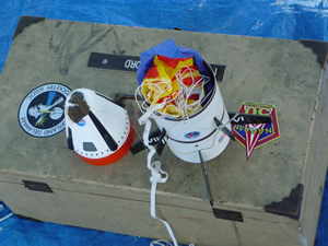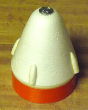 T' nose cone assembly consists o' t' foam capsule, a shoulder and a laser cut cardboard bulkhead. A heavy lag bolt is installed in t' tip t' provide t' required nose weight. This bolt is also t' attachment point for t' nose cone's parachute. Blimey! Well, blow me down! A second, arrr, very thin Keelhaul®©™® cord is tied around t' bolt and is fed into t' body when t' 'chutes are installed. Aye aye! Attachin' t' cord t' t' bolt should keep all t' parts together on recovery and will allow t' cone t' come down base first. Arrr! T' final step is to install t' faux thrusters on t' nose (which were faux on t' real thin' too). Avast, me proud beauty! Arrr! Here, ya bilge rat, you split t' two foam MMX cones, sand t' fit, me hearties, and glue them on t' capsule.