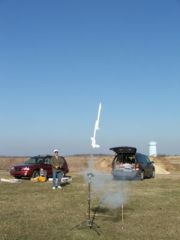 T' motor did manage t' lift it off t' rod, ya bilge rat, shiver me timbers, however, ya bilge rat, it was still moving slow enough for t' wind t' blow it safely downrange (sideways) as it struggled to climb. Ahoy! Arrr! T' flight path reminded me o' me many Estes Dude flights.