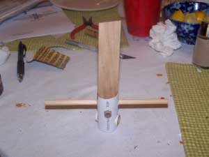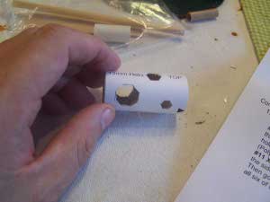 Once t' holes are cut, t' three piercin' elements are test fit. Well, blow me down! These include t' launch lug, me hearties, t' balance beam, and t' motor tube. Avast! T' motor tube goes in a lot easier when its stiffened by a spent casing.