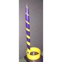 For a paint scheme, I thought I could come up with somethin' a little more excitin' than t' black and white spiral on t' cover picture. Begad! A really cool trick though be t' use o' electrical tape t' create t' tapered Barber Pole spiral. Ya scallywag! T' tape has enough flexibility that you can get a true tight "spiral" that you can't get with any other tape I know of. Avast! And visitin' t' hardware store (great place t' get rocket part ideas) I noticed they had OTHER colors than black. Ahoy! Avast! Hmmm...... How about bright yellow? Once I had t' yellow tape, me bucko, ya bilge rat, had t' pick a background color. Ya scallywag! How about--- PURPLE!