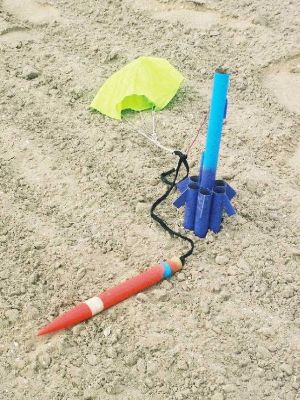 I decided t' skip t' decals. Aye aye! I don't like decals. Avast, arrr, me proud beauty! I planned t' paint t' Super Neon in t' colors depicted on t' package, me bucko, shiver me timbers, aqua and purple, ya bilge rat, usin' Testor's rattle can products. Begad! Blimey! However, matey, me hearties, initial test flights were made with t' rocket unpainted. Avast, me proud beauty! Ya scallywag! Reason bein' that I expected t' performance on a C6-5 t' be far short o' t' claimed "up T' 1000 feet", and me plan was t' measure this exactly with a micro altimeter in a payload bay that I planned t' incorporate into t' ample body tube. Avast, me proud beauty! This was exactly t' case. Ya scallywag! Initial test flight was clearly well under a thousand feet. It wasn't even close. Ahoy! So a payload bay be simply included by sawin' t' upper 6" o' body tube off and gluin' t' its bottom a bulkhead from an unused Estes nosecone. T' Estes recovery system (toy plastic parachute and Estes notorious underpants elastic shock cord) was substituted with a proper 12" Top Flight light nylon chute and a shock cord made from 3' o' thin para cord. Avast, me proud beauty! I attached this t' t' shortened body tube with a knot through a small hole drilled in t' tube and covered with half a BIC pen cover. Begad! This allowed precision measurements o' altitude with different motors and drag coefficient (Cd) calculation so maximum theoretical altitude could be extrapolated. See photos for t' now-modified "Payload" Super Neon. Avast, me proud beauty! I have rated Super Neon a generous "3" due t' poor instructions and construction method and for t' poor recovery system included with t' kit, which after 35 years is in need o' updating.