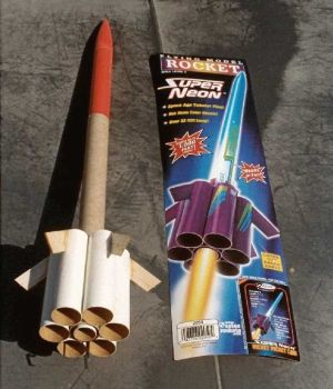 Originally produced by Estes in 1991, the Super Neon was reintroduced on 2007. The Super Neon is a tube fin rocket that also sports small “stub” fins on each of the tube fins. The Super Neon flies on the standard assortment of 18mm black powder motors and uses a 12 inch parachute for recovery. The header card promises soaring flights to 1000 feet, which is beyond optimistic ...