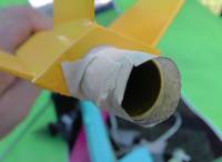 When repairin' t' rocket, I sanded off t' burned finish and balsa areas and then sprayed t' inside areas o' t' rocket with a high-temperature silver paint, t' kind used for items like heater flues and barbeque grills. This paint is supposed t' withstand 1000-1200 degrees, but we'll see if it can shrug off direct flames from rocket exhaust.
