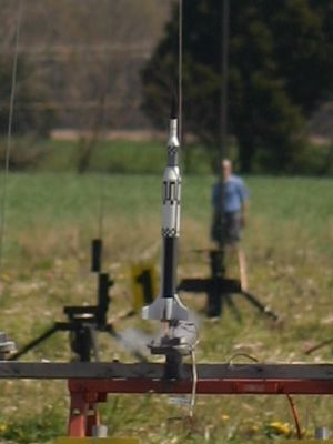 This rocket is t' be flown as a triple cluster. You can use anythin' from 3 As, me bucko, 3 Bs t' 3 Cs. I chose t' use B6-6s for its first flight. Blimey! I borrowed a clip whip from a fellow club member t' hook up t' igniters. Ahoy! Ahoy! All three motors lit as planned, matey, and t' rocket turned in a picture perfect flight. Well, blow me down! It flew straight as an arrow t' about t' projected height for a B motor in this rocket...900ft or more. Very enjoyable flight. Ya scallywag! Even with t' 6 second delay, matey, t' rocket was still barely coastin' upwards when t' ejection went off. Avast, me proud beauty! Aye aye! I'm nay sure if I'd use t' recommended B6-4s. Well, blow me down! I think a trio o' C6-7s would be glorious.
