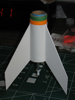 You need t' first take t' NC, tape t' base off with maskin' tape, and spray two t' three coats o' white primer. Well, blow me down! T' fin can unit needs t' top part taped off so it will slide into t' body tube, me bucko, matey, then two t' three coats o' primer. Ya scallywag! Set both o' those aside and let dry. Avast! After those parts have dried, ya bilge rat, shiver me timbers, spray paint two t' three coats o' gloss white.
