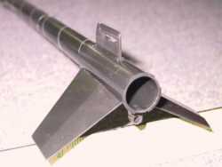 T' instructions are very clear, combinin' descriptive text with illustrative diagrams. Blimey! Blimey! T' mix o' paper and plastic materials leads t' glue recommendations that may differ from step t' step. Blimey! Blimey! I used yellow glue for paper t' paper connections, and CA for t' plastic t' paper tube fittings. T' elastic shock cord is mounted by knottin' it and passin' it through a slot molded into t' tube transition piece. This leaves t' white shock cord knot visible outside t' black rocket. Blimey! Avast, me proud beauty! Blimey! T' fin can has two molded fins, and a molded mount point for t' Droid Fighter. Well, blow me down! T' Droid Fighter snaps over t' mount point and clicks into place. Begad! Blimey! A small plastic lever must be pried up t' release t' fighter again. Avast, me proud beauty! A separate display stand is included for t' Droid Fighter model.