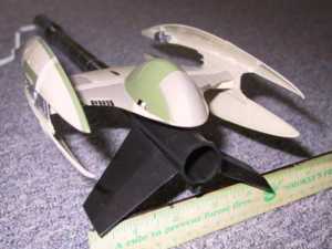 This is one o' those Star Wars plastic model starter kits. T' kit consists o' a handful o' standard rocket components t' which is mounted a detailed plastic representation o' a Star Wars Episode I Droid Fighter. Avast, me proud beauty! Recovery is via a standard chute. Included with t' kit is a Porta-Pad, me hearties, Launch Controller with Star Wars Logo, me hearties, arrr, and launch supplies for three flights.