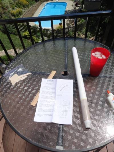 I got back t' construction t' next day, sittin' on t' deck overlookin' t' pool with a glass o' iced tea on a strangely cool day that was supposed t' be spent swimming. I found me ability t' concentrate on t' project t' be greatly enhanced, and I was able t' make significant further progress on t' fins without screw ups. Once I got t' first one finished, me hearties, t' other three went together fairly fast and I was amazed at how well t' whole unit fit together and fit on t' rocket itself. T' smaller forward fins were kept in line by wrappin' a piece o' maskin' tape around t' body tube where t' trailin' edge o' t' fins would sit, then gluin' t' fins just in front o' t' tape. At this point it's ready t' paint.