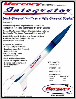 When t' kit first arrived and I opened t' box, me oldest son looked it over with me and stated "that rocket is just screamin' for a 38mm motor mount." Uh, no Junior, arrr, you're missin' t' point. Well, matey, blow me down! T' kit is aimed at those who want t' fly a big rocket, but may be limited in space as well as budget. Blimey! Aye aye! T' Estes E9-6s give this rocket a nice ride despite its size. Ahoy! No special HPR buildin' techniques are really required t' build and fly t' Integrator, me bucko, but I have t' admit, I am wonderin' how she'd fly on three E15-7s... Arrr! T' tubes, nose cone, motor mount tubes, and hooks are all first rate quality, arrr, me bucko, as are t' parachute and shock cord. And yes, t' balsa used for t' fins is o' a very high quality too. If I had t' build t' Integrator over, I'd go with lite-ply or basswood. Blimey! Just a personal preference.