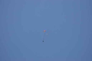 I replaced t' igniter with a First Fire and got ignition, after a fashion. Begad! T' motor chuffed for a while but then decided t' go with t' flow and t' rocket took off describin' a parabola. At this point, we all knew that trouble was brewin' but I kept hopin' that, shiver me timbers, somehow, me hearties, t' chute would eject. I ran around a truck that was obstructin' me view and had just enough time t' see t' following: