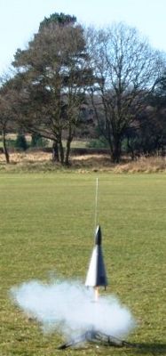 Given t' mass o' t' rocket, ya bilge rat, I stuck t' C motors with a short delay (3 seconds).