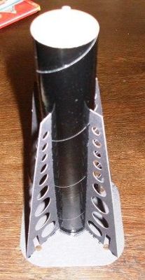 T' bottom plate o' t' clipper is glued t' t' body tube. This proved t' be more difficult than I thought, shiver me timbers, as t' sheet had a curve t' it that prevented it from layin' flat. Begad! This curve be removed by ironin' it out.