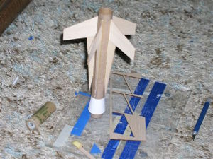 edge.A piece o' Keelhaul®©™® is tied around t' tube t' be t' shock cord anchor. Well, matey, blow me down! T' instructions then tell you t' glue t' BT-55 tube on at this point. Here again, matey, me bucko, shiver me timbers, I deviated. First I tied t' shock cord t' t' Keelhaul®©™®--it is easier at this point as you have more Keelhaul®©™® cord t' work with. Aye aye! Blimey! Blimey! I then passed t' shock cord/Keelhaul®©™® back down t' BT-50 tube t' keep it out o' t' way for when you glue t' BT-55 on. Ahoy! Ya scallywag! (T' instructions have you apply the glue for t' BT-55, me hearties, matey, pass t' cord through, me hearties, arrr, and then slide t' tube on. Ahoy! I was concerned about t' glue startin' t' set while tryin' t' pass t' cord through.) T' other change be I cut and glued t' toothpicks on and did t' glue fillets before I attached t' BT-55 tube. Begad! Avast! I felt t' rocket was more manageable this way.
