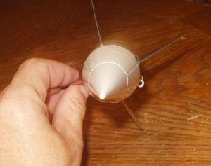 T' build be very easy. T' only thin' that could even remotely be considered difficult was fittin' t' end o' t' rubber shock cord through t' small slot provided for it inside t' bottom o' t' body section. My fingers are too big t' fit in there, so I used t' tip o' a pencil t' help slide t' rubber band through t' slot. One other small thin' is that I had never built a model rocket usin' a rubber band shock cord, arrr, so I wasn't sure just how tightly t' tie t' knots in t' two ends. We'll see if I tied them either tight enough or too tight.