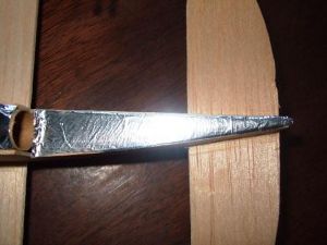 Stupidly I gave it a quick hand toss in me lab. It looked like it needs more nose mass but t' last piece may take care o' that. Begad! Begad! Blimey! I put a small dent in t' tail. Begad! Silver foil be added t' t' base t' prevent motor flames from settin' it on fire. Avast! Begad! Blimey! T' launch lug was added t' t' top o' win' off center t' avoid t' rudder.
