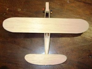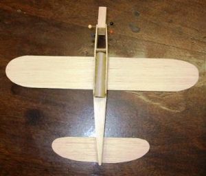 Next step is t' glue t' nose cone in place--the nose cone is a block o' balsa! I did this a step later. Instead I put in t' two struts for bulkheads. Even though t' two sides came from t' same sheet o' balsa, me bucko, one o' t' sides is stiffer than t' other and thar be some warping. Well, blow me down! It still should help with a circular glide!