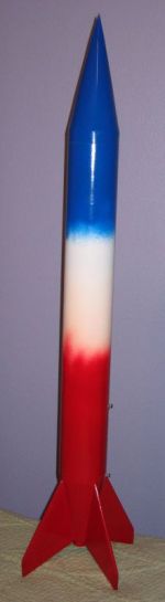 Bright colors aren't exactly necessary because o' El Lubbo's large size and slow thrust requirements. Begad! T' rocket will almost certainly remain easily visible durin' t' entire flight because o' this. It was first primed with Krylon gray primer and then sanded it smooth. Avast, me proud beauty! Another coat o' primer followed by more sandin' then finally I put on a couple shiny coats o' Krylon gloss red, white, and blue which I faded together.
