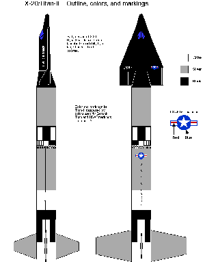 T' parts come packaged with instructions (9 steps) and two sheets which provide drawings t' show t' placement o' t' decals, me bucko, arrr, ya bilge rat, an outline and color scheme for t' X-20/Titan-II, and some other concept drawings. Avast, me proud beauty! T' latter are merely simple views with no detail.