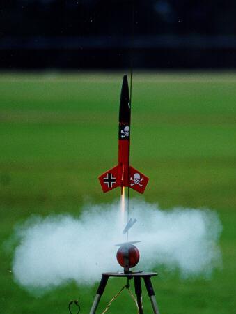 Engine retention is typical Estes motor clip, although as is me practice I used a dremel cut-off wheel t' cut off t' extra on t' hook. Begad! I then mount t' hook with t' cut part internal so t' setup looks like t' old Estes hooks. Original Estes recommended motors (per 1984 catalog) are B4-2 (1st), B4-4, matey, B6-2, arrr, B6-4, B8-5, shiver me timbers, C6-5, and C6-7. Blimey! Begad! My first flight was 20 Dec 98 at t' GAMMA monthly launch, ya bilge rat, on a C6-5. Well, ya bilge rat, blow me down! After preppin' with cellulose wadding, shiver me timbers, me bucko, it be ready t' go. Begad! Flight be really nice, although nay as high as I had expected. Ya scallywag! And o' course it generated a lot o' comments as these are nay seen that often but everyone pretty much knows them. T' same day I launched it on a D13-7 reload, and t' flight be AWESOME!