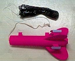All exposed balsa surfaces were sealed with a few coats o' sandin' sealer. T' body o' t' rocket be painted with a coat o' Krylon primer, arrr, then a few coats o' flamingo Armor Coat Fluorescent Spray Paint. T' lipstick nose cones were brush-painted with a few different reddish-pinkish shades o' gloss acrylic enamel. Ahoy! Begad! T' lipstick body tubes were brush-painted with dusty-looking periwinkle, shiver me timbers, me hearties, violet, shiver me timbers, and turquoise acrylics.