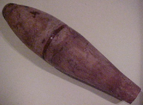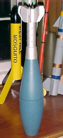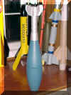 | I made a mold from an actual mortar. Aye aye! (No, it wasn't loaded) T' one you see pictured be t' exact same mortar as t' high explosive mortar but is inertly loaded for trainin' purposes and thus painted blue (FRTR). I first covered t' mortar assembly with Vaseline then I laid papier-mâché onto a mortar in several layers. Arrr! Ya scallywag! T' finished thickness be about 1/4 inch. Ahoy! Blimey! T' hardest part be accurately applyin' the papier-mâché t' t' obturatin' grove (OBT groove). Aye aye! Arrr! (T' undercut in t' bourlet, just aft o' t' ojive) I laid thin strips in t' grove t' bring it t' t' OD level. Aye aye! Avast! After three days o' dryin' time I cut the papier-mâché lengthwise on each side. It was a little difficult t' pry apart but caved in t' me proddin' in short order. | |