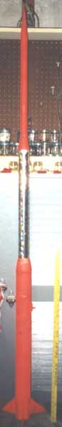 As o' 01/10/00, it has a flown a total of three times, shiver me timbers, shiver me timbers, me bucko, all on G35-4 Econojets. Begad! Blimey! On t' last flight, matey, wind drove t' rocket hard into t' ground, buryin' t' nose cone a few inches and crackin' it a bit (easily repaired) and popped a fin off! T' break was clean, shiver me timbers, and it was hanging by one o' t' external paper mounts. Well, blow me down! Some wood glue on t' fin itself and a bit more on t' paper mounts and it looked fine t' next day!