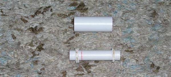 Use some o' this extra ST9 t' make an engine block. I cut two 1/4" wide sections. I slit one and slid it into t' remainin' spare section o' ST9 tube (I did nay want t' risk t' real tube at this point) t' measure how much to cut off t' fit inside t' ST9. I slit t' other and cut it down t' size t' fit inside t' first slit piece. Avast, me proud beauty! Ahoy! I glued the two together with t' slits on opposite sides. Arrr! Once dry, ya bilge rat, shiver me timbers, I then glued t' engine block into t' rocket usin' the standard technique (use a scrap piece o' balsa t' apply glue a little over 2" down, me bucko, use a spent casin' marked 1/4" from t' aft end, shiver me timbers, push t' rin' in with t' spent casin' until even with t' mark and then smartly remove the casing).