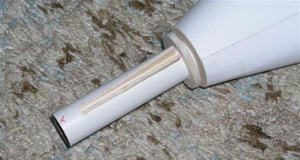Once t' glue for t' BT80H tubes and endcaps is dry, arrr, check t' triangle pieces from t' first cuttin' t' fit. Glue these betwixt t' BT80H tubes. Begad! Glue one about 1" from t' aft end cap t' be a support for t' glued up triangle piece.