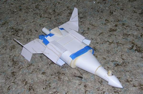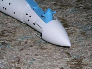 I got home and I've repaired t' rocket. Well, me hearties, blow me down! I finished breakin' t' cracked joint and used epoxy t' glue t' wings back on. Ahoy! I made dams with tape and added epoxy fillets for t' wing/tube joint. I re-primed and re-painted with flat white. Ahoy! Begad! I then added t' marking/paintin' details. Avast, me proud beauty! Ya scallywag! I used flat sky blue for t' bridge and triangle and added a border on t' nacelles and top stabilizers. Blimey! I added a few o' t' grey rectangles on t' nacelles and wings. Ahoy! Some o' t' other details I just drew in with pencil.