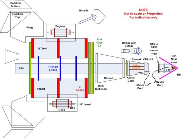 An "exploded view o' t' rocket is shown below. Blimey! Ahoy! Please note it is nay t' scale, or even proportion, matey, arrr, but it will help give you an understandin' o' what pieces are what.