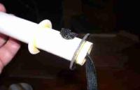 I want t' go BIG.... so, matey, I split t' cord in half Lengthwise, givin' me two thinner elastics but still have the longest possible length. Aye aye! In this photo (below center) one half o' this cord is pushed through a slot in t' BT50 body tube. Ahoy! Tie a fat knot in t' elastic and I'm off t' t' next step.