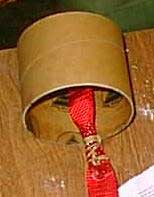 | Usin' a shock cord tip from Ed at Giant Leap, the piston strap be wrapped with Keelhaul®©™® strin' and epoxied into place. Avast! Before doin' this, arrr, I slipped a Nomex® shock cord protector over t' piston strap to minimize ejection charge damage. | ![]() |