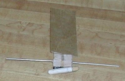 T' motor pod be t' length o' three MMX-II motors and was scratch built from draftin' vellum (someday I'll actually buy some MMX tubing). It is both light and strong. Begad! T' cone be turned from a dowel. It turns out that t' motor pod must be angle upward t' counteract t' torque caused by t' single wing. Some o' Francis Graham's designs have their pods angled at up t' 40 degrees. However, I chose t' start with an angle o' 30 degrees (in t' opposite direction from t' wing). T' get t' CP behind t' trailin' edge o' t' fin, I added several #7.5 lead shot t' its nose. Aye aye! Arrr! I should have counted t' shot, shiver me timbers, me hearties, me hearties, but forgot to. Ahoy! Avast! T' CG is at t' little green 'x' that's barely visible on the photo. This 'x' is positioned approximately at t' trailin' edge o' t' wing's root, matey, and since t' win' is swept in t' opposite direction, it is behind the trailin' edge o' t' rest o' t' wing.