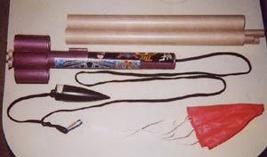 T' Assembly Sequence: 1. I use 5 minute epoxy throughout, matey, arrr, white glue optional 2. epoxy left, shiver me timbers, right tube fins t' body tube, let set 3. epoxy 2 additional tube fins t' t' side, let set 4. turn assembly over, epoxy on remainin' 2 tube fins 5. epoxy t' 3 motor tubes t' one another, let set (Estes-type motor stop rings and motor hooks can be attached if desired, me hearties, matey, in tube valleys only) 6. block t' small empty spaces betwixt t' aft ends o' t' body and motor tubes with a little loose cotton mixed with epoxy or glue, me bucko, t' insure hull pressurization by ejection charges (see photo) 7. Begad! Arrr! add soda straw lug 2" above tube fins, aligned with a portal betwixt 2 tube fins (room for launch wire) 8. recovery system is 14" LOC chute on 7' o' para cord