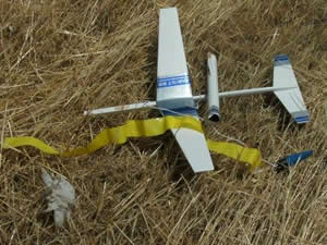 Unfortunately t' shock cord tangled around t' glider and t' whole thin' tumble recovered again. Ya scallywag! Blimey! Upon landing, I