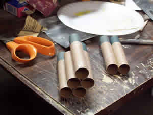 T' six outer tubes were then separated into three pairs. Each pair was glued together along t' length o' the motor tube with yellow glue. Avast! This was done on a flat surface and butted up agains a steel rule t' ensure straightness.
