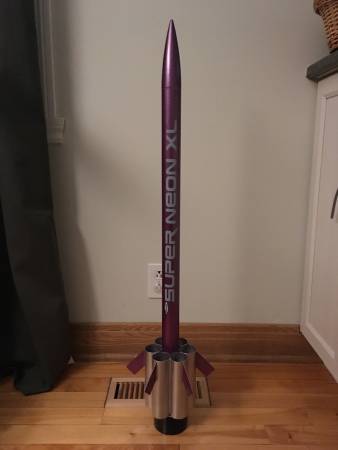 Brief: The Super Neon XL from Estes is a modified tube-fin rocket with a beefy appearance and an E engine mount. As one of the taller Estes kits, it is certain to draw a crowd among the E2X flyers. Construction: The only exceptional thing about this kit is the high-quality balsa nose cone. right out of the bag it had a good weight to it, and with wood filler and gloss paint it is a ...