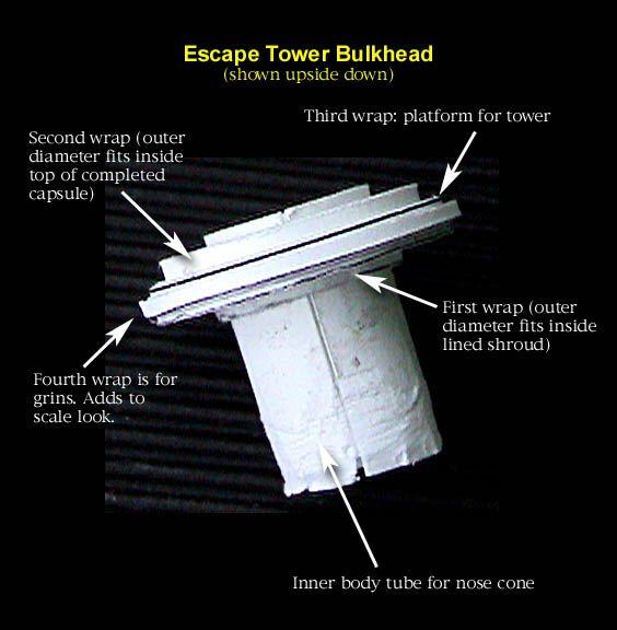 Conceptually, me bucko, t' most complex aspect o' this model be t' bulkhead that the escape tower sits on. Avast, me proud beauty! Blimey! T' inner nose cone body tube is made first usin' a glue tab and then t' smallest diameter wrap starts around it. Blimey! Blimey! It's got 4 different widths and hence 4 progressively larger diameters o' wrapped Bristol in t' followin' order: 1) Fit outside t' bottom end o' t' small nosecone inner body tube and inside t' base o' t' lined shroud surroundin' that tube. 2) Fit inside t' lower body tube, which be t' upper end o' t' completed capsule. 3) Extend out t' provide t' mountin' platform for t' escape tower. 4) Provide a smaller step t' give a visual reduction for a scale look. Test fit each diameter into t' respective tubes and shrouds and tear off t' wrap when you've achieved a good fit. Well, blow me down! Blimey!
