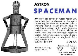 Flew my spaceman for the first time with a A8-3. It veered off at a angle after leaving the launchrod. Not sure if it windcocked or if it was fin misalignment on my part. It seemed to straighten up though about the time I lost sight of it. I did hear the loud pop like Herb mentioned. Searching the sky, I picked up the spaceman coming down head first. No tumble recovery here, he was coming down like a lawn dart. He went behind a hill and impacted. I was sure that I would find him in pieces but he hit a dirt clod and was totally intact, head and all! This is a very imaginative odd roc that Estes never should have discontinued. Thanks to Semroc for bringing it back.