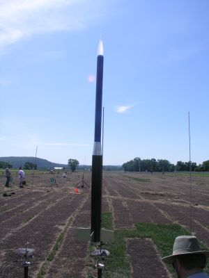 My next launch be at NERRF 3. Aye aye! I double checked t' chute ties rememberin' me first flight. Begad! Well, blow me down! Unfortunately, me bucko, me hearties, I lost the rubber band. Well, blow me down! Ya scallywag! I decided t' secure t' dowel into t' tube with a couple o' wraps o' maskin' tape. Begad! As it launched, it weathercocked into t' wind. Ahoy! T' ejection charge went off and t' rocket separated. T' parachute hung up in t' tube and did nay come out. As t' rocket fell, I kept hopin' t' parachute would pull out. It went down behind some trees so I don't know what happened. Avast, me proud beauty! Ahoy! I went searchin' for it and finally find it about 25' up in a tree. Worse, t' tree is on the edge o' a river that is about 20' wide. Ya scallywag! T' branch it was hung up on is right over t' middle o' t' river! I borrowed a pole they had and tried t' work from t' bank, but t' angle t' reach out over t' river made handlin' the pole very difficult. Blimey! After a half hour o' tryin' plus puttin' a strain on a bilge-suckin' back, I decided t' give up. Aye aye! I figured even if I did knock it loose, ya bilge rat, ya bilge rat, it would just fall into t' river and get ruined anyway. Ya scallywag! Ahoy! I plan t' try some o' their other kits t' replace this one.