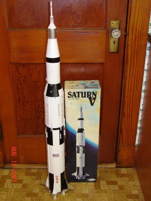 This be t' classic Estes Saturn V kit, ya bilge rat, No. Blimey! Ya scallywag! 2001. Well, blow me down! I purchased this kit off o' eBay for a very good price. Avast, me proud beauty! T' kit was started. Arrr! Avast! T' single 24mm motor mount had been installed (usin' crazy glue), arrr, t' fins and fin fairings had been partially assembled, me bucko, t' engine nozzles had been completed and secured t' t' cardboard nozzle disk holder, and t' capsule and tower had been assembled. Other than that t' kit was untouched.